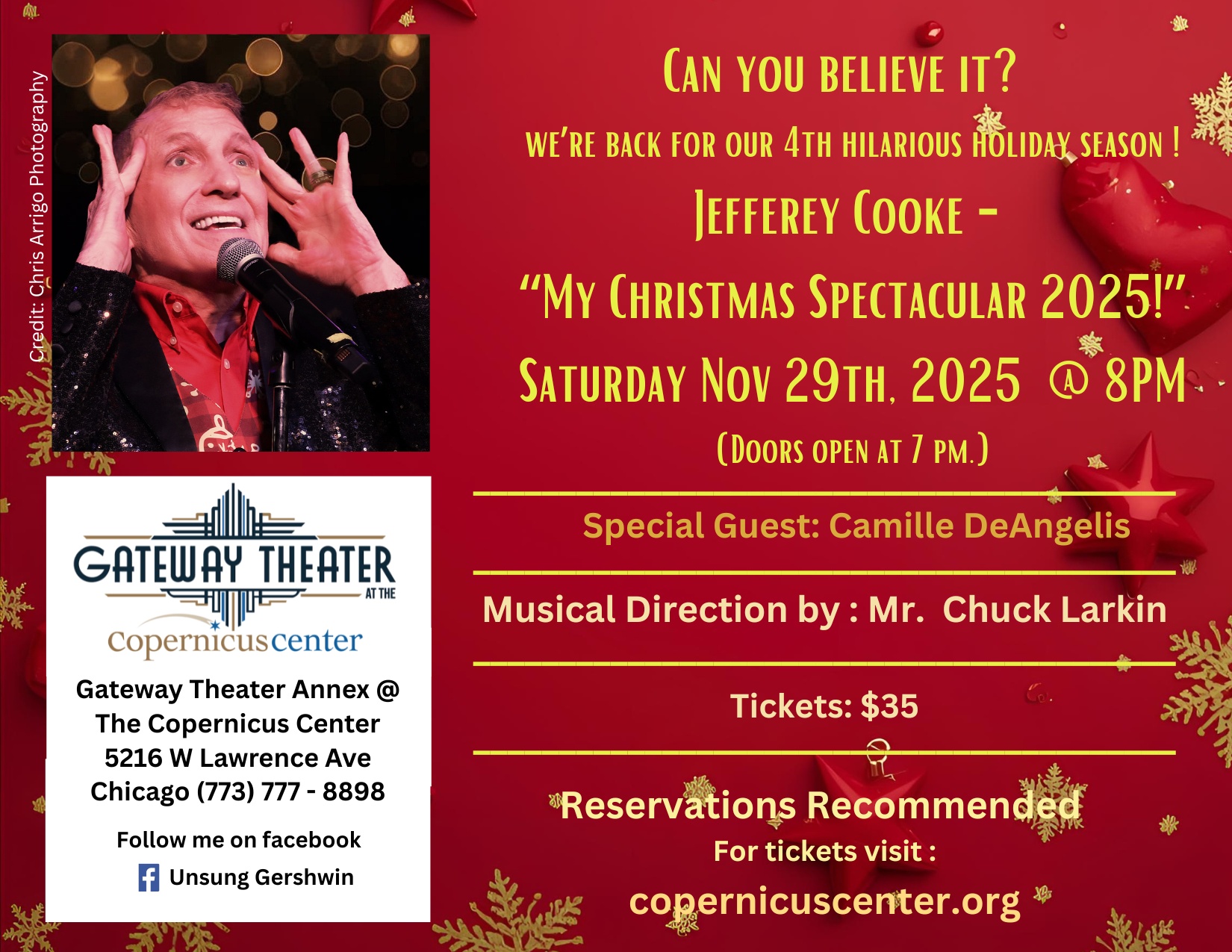 ![]() Jefferey Cooke- “My Christmas Spectacular 2025!” Jefferey Cooke and his “My Christmas Spectacular” returns to the Chicago cabaret scene for a 4th holiday season. Please join us for a blow-out holiday celebration that is bound to push the limits of “good taste”! For One Night Only, after three years at Venus Cabaret Theater, Cooke and Company […] |